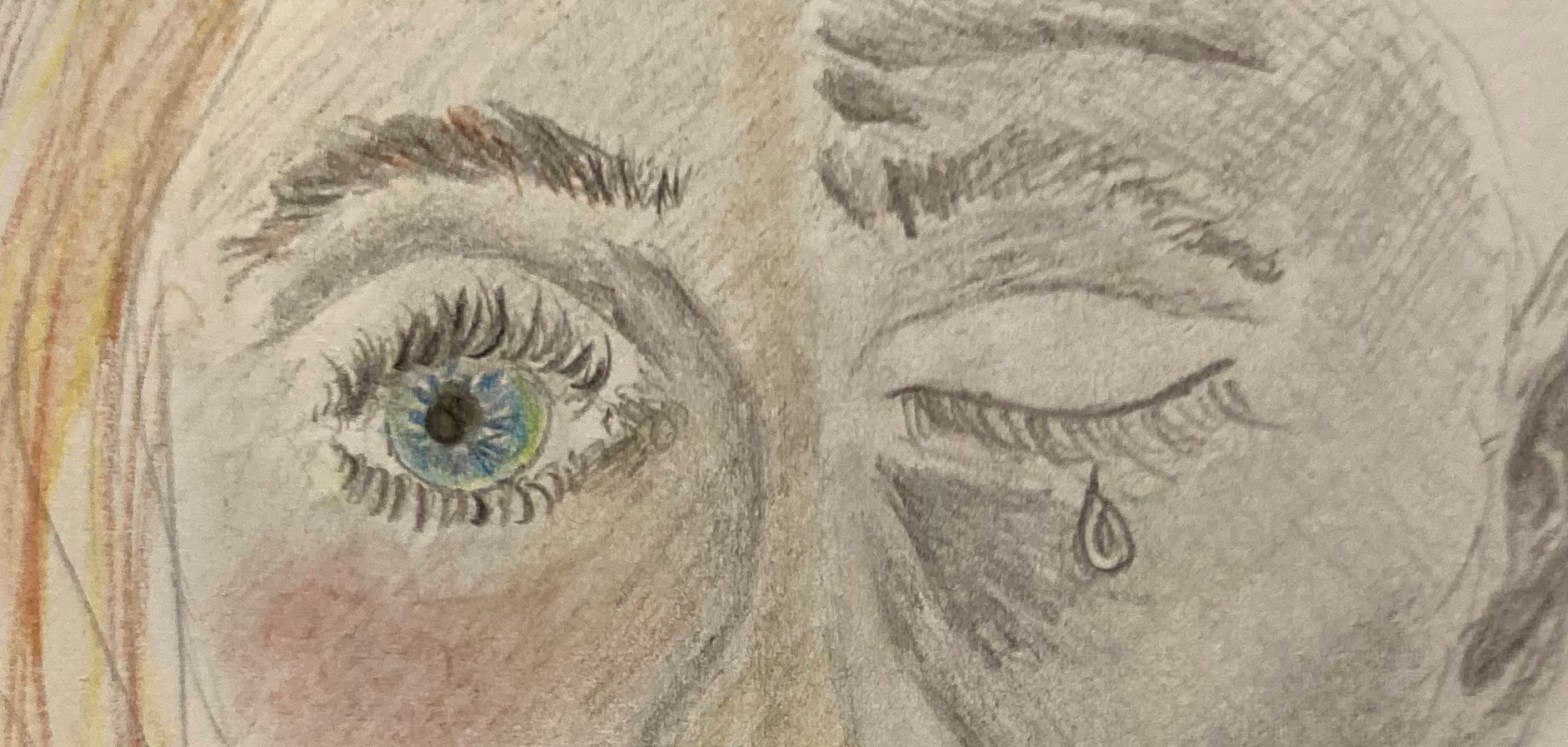 A pencil drawing of a girl with a split face between how she portrays herself to the world and the sickness she feels on the inside.