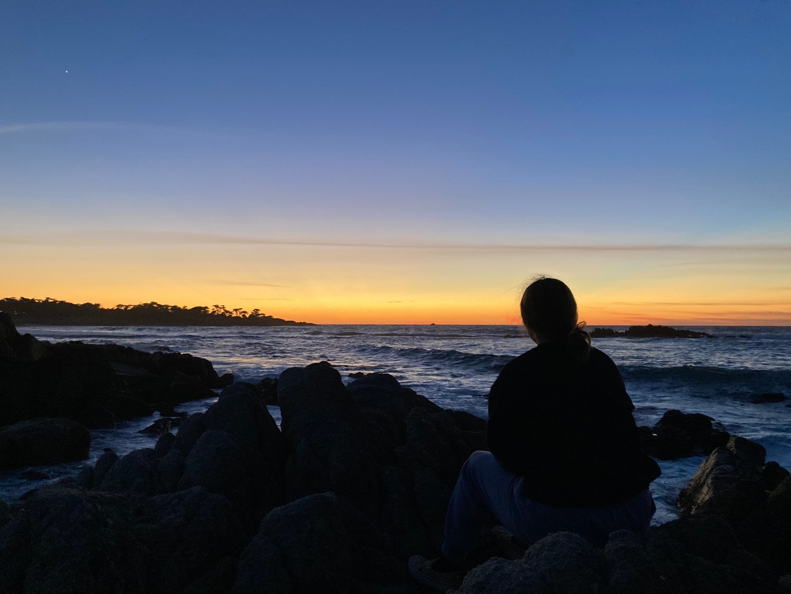 A surfer walks along the rocky shoreline of Northern California, silhouetted by the setting sun.